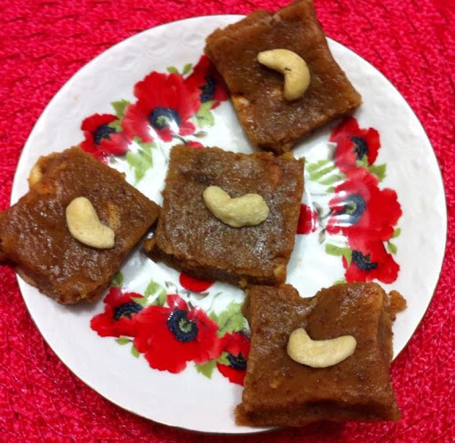 5.Smear a Plate with a rim with ghee,put the dough on it and spread it evenly.Allow it to cool for 30-45 minutes and cut to pieces and garnish.