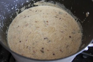 2.In a pan boil milk, once it comes to a boil add sugar,condensed milk and cardamom powder.Add the vermicelli and the roasted nuts.Boil just to a point when vermicelli is soft(less than 5 minutes),do not overcook.