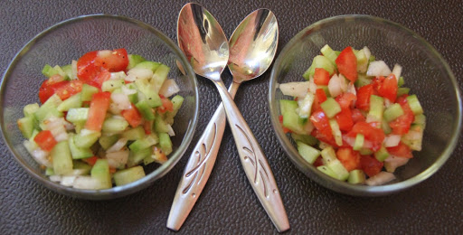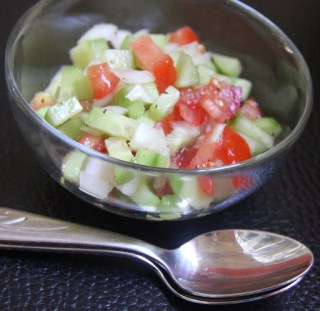 My mom used to give us cucumber salad in India during the hot summer months.Cucumber is 90 percent water which will keep you hydrated in summer.This preparation hardly takes 5 minutes and needs no cooking.