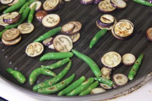 3.Grill the green chilies on the pan. The purpose is to char the eggplant and green chilies.