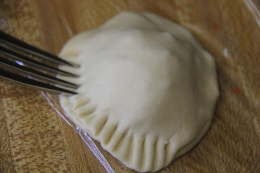 8.Now place the another circle on top and with the help of a fork gently press down and pull out the edges all around to seal the pocket. Repeat until all the mixture is complete. You might have to re-roll your leftover dough with some butter like a roti and reuse.
