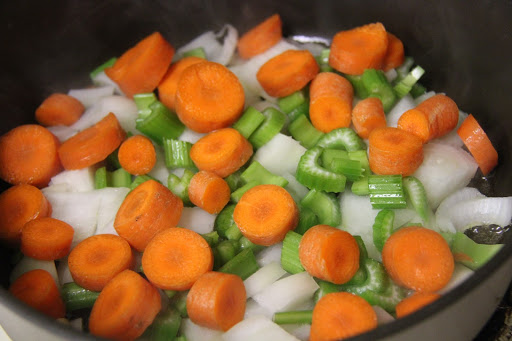 2.Add the onions, carrots and celery to saute until soft, about 5 minutes.