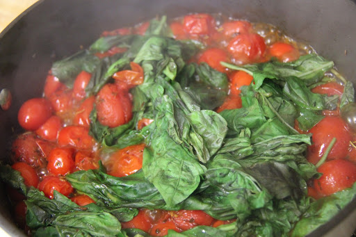4.In the same pan take the tomatoes( I used cherry tomatoes because they were the only ones i found that were ripe enough), add 1 teaspoon of oregano and saute until tomatoes are soft and start leaving juices.