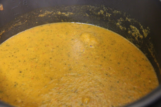 6.Pour all of the tomato puree and vegetable mixture in a slow cooker, add 2 cups of vegetable/chicken broth, sugar, salt and pepper, Stir and slow cook for 2 hours. Slow cooking will make the flavors from the vegetables develop. If you don’t have a slow cooker, cook on stovetop on very low flame for about 45 minutes.
