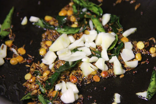 2.Add mustard seeds and cumin seeds and fry till the seeds splutter. Add the chopped curry leaves and garlic and fry well.