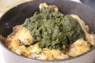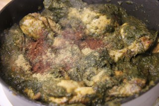 6. Add sorrel leaves paste and mix. Add the garam masala powder and salt mix and cover the pan and cook until the chicken is cooked all the way.