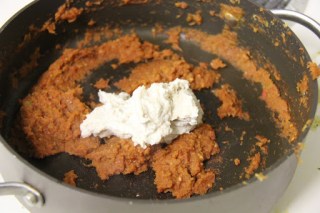 6.Now add the tomato paste and keep stirring until it also comes to a dough consistency.