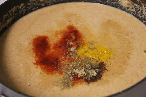 7.Add the cashew paste,water,masala,red chili powder,turmeric and salt and let it simmer for 2 minutes.