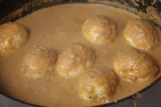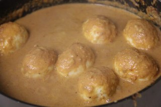 8.Check the taste of your gravy and add the eggs into this and let simmer for 5-10 minutes stirring in between.Turn of the stove.