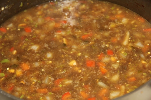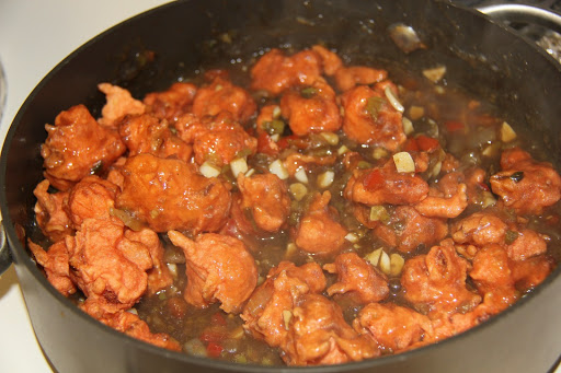 2.Add the green chili sauce, soy sauce, vinegar and tomato ketchup,corn starch and little water, mix and simmer.