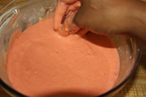 3.In a bowl take the maida, corn starch, rice flour, eggs, ginger garlic paste, red chili powder, salt. Add water little by little and prepare a thick batter enough to coat the florets.You can also add food color if you like.