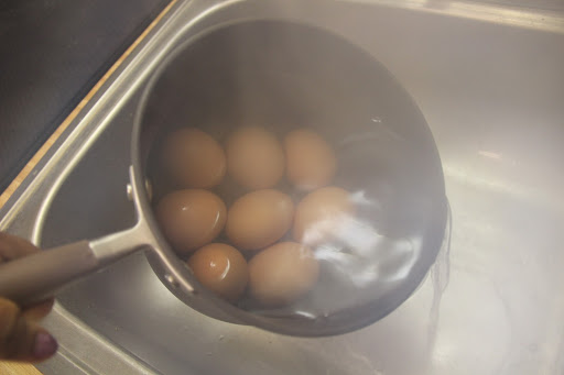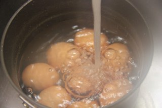 5.Run the eggs through cold water.This will stop the cooking process.Cover in cold water, let rest 2-3 minutes and Gently tap the eggs and peel.