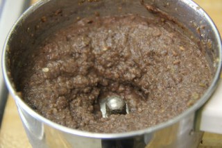 3.Take 1/4 of the beans and grind them with coriander seeds, green chilies, cumin seeds and garlic cloves to a fine paste and keep aside. Do not add extra water for grinding, use the strained liquid.