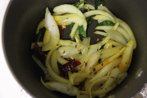 6.Add the onions and fry for 3 minutes.Add turmeric