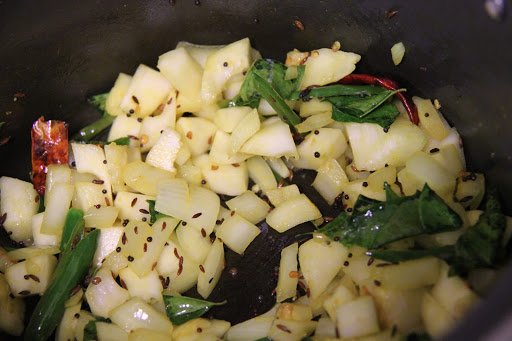 1.In a pressure cooker heat some oil and add the cumin, mustard, red chili, green chili, garlic and curry leaves and saute till mustard splutters.