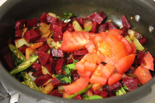 3.Add the chopped beetroot and tomatoes, and asafoetida and saute for a minute.