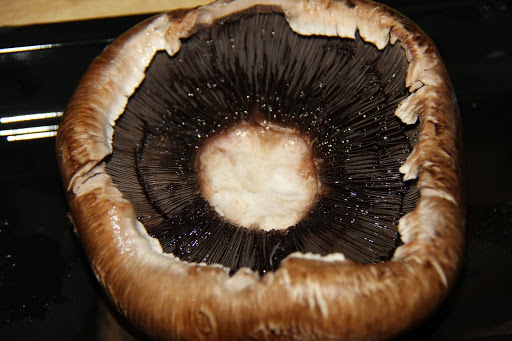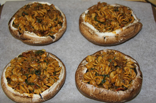 6.On a baking sheet place the mushrooms and place 1/4 of the pasta on each of the mushroom.
