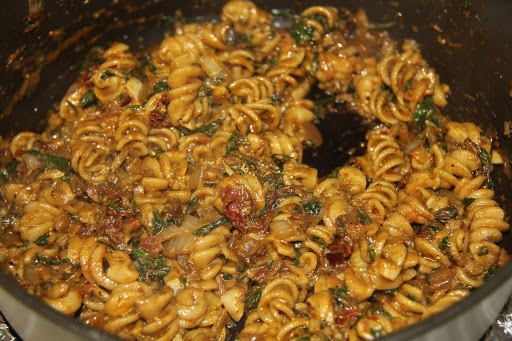 5.Add the spinach, minced mushrooms stems, pesto and marinara and cook, about 3 minutes. Add the pasta and stir. Check your salt and pepper.