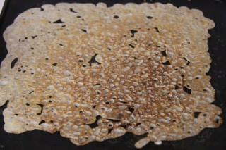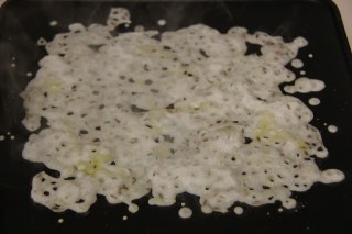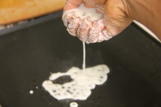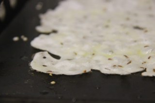 5.With your hand take little by little of the rava mixture and sprinkle it on the pan, such that it forms a square or a circle.