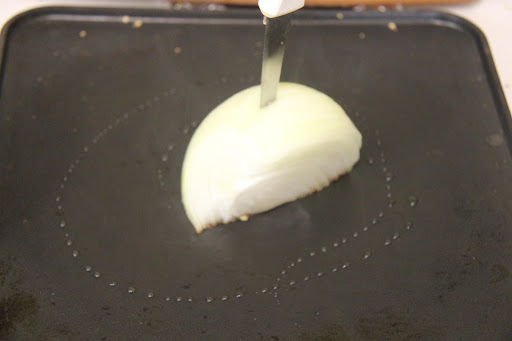 4.Heat the Tawa or griddle on high ,spray some oil and smear it with a half cut onion.