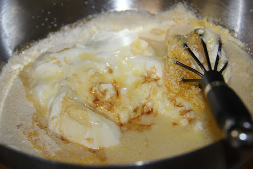 2.In a bowl take the coarse semolina, fine semolina,3/4 cup sugar,baking powder, melted butter, coconut,eggs,vanilla extract and yogurt and mix well without any lumps.
