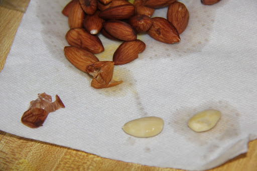 1.In a saucepan take water and bring to a boil.Add the almonds to it and boil exactly for 1 minute.