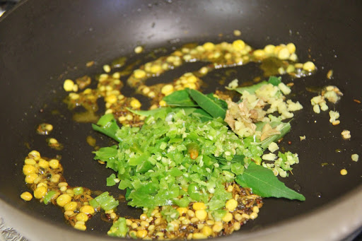 4.Add chopped onions, chopped ginger,salt, asafetida and green chili and saute for 3-4 minutes.