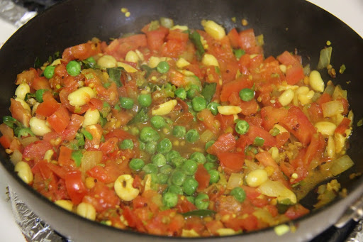 6.Add tomatoes and peas and let cook until tomatoes are soft.
