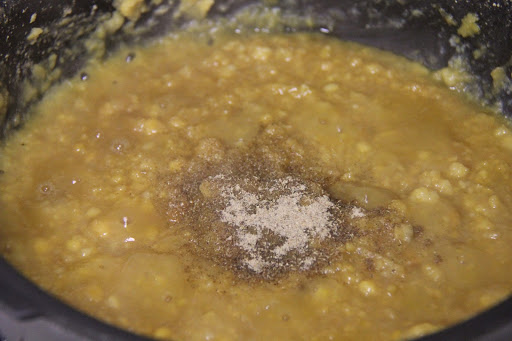 2. To the chana dal , add jaggery and let cook ,simultaneously mixing and and mashing the mixture until it comes together.Add cardamom powder and mix and turn off the stove.