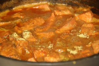 7.Add the fish pieces to the pan and cover with the lid and let cook on high flame for 12 minutes.(if you have time you can let it simmer on lower flame for around 20 minutes until your fish is done).Once the fish is cooked add the methi powder and give it a light stir and let stand for 1 minute and turn off the stove.