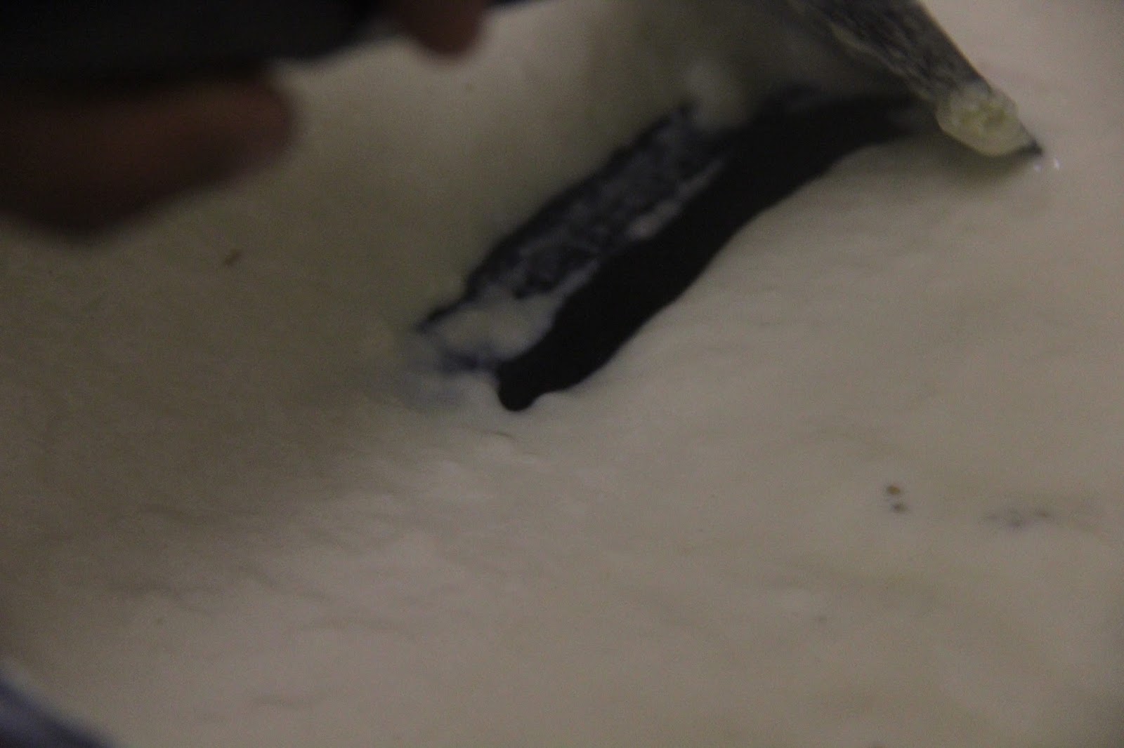 This has to be stirred continuously, leaving it even for a minute can make your milk stick to the pan and get the burnt residue and taste into the kova and a kova that is brown in color.