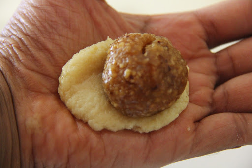6.Refrigerate the kova for about 1-2 hours. Take some ghee on your palm and spread some kova into a flat circle. Now place the previously rolled kobbari louju in the centre and roll the kova around it.At this time the kova can still be rugged on the outside.