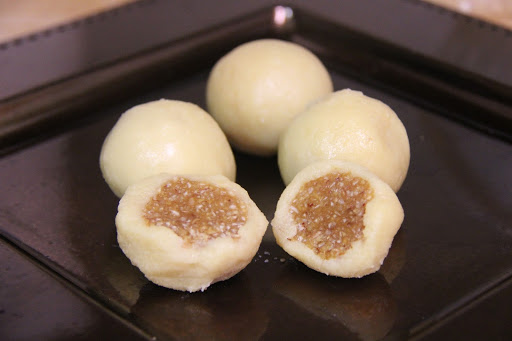 1.Melt butter in a pan,add milk powder and condensed milk and keep stirring until it forms a thick mixture. Roll it around the kobbari louju while it’s still warm enough to handle.