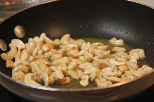 4.In a separate pan heat the ghee,roast the cashews and raisins and add them to the ada along with the cardamom powder and stir.Let cool and serve.