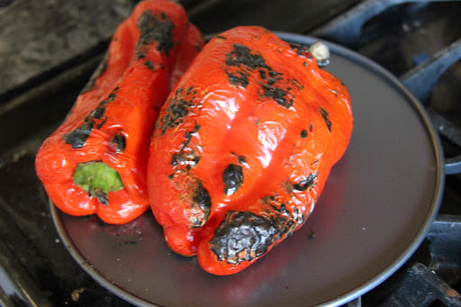 1.Fire roast the red peppers until they are lightly charred on all sides.