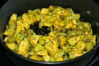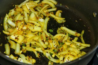 3.Add sliced onions and turmeric and saute for 5 minutes till translucent.