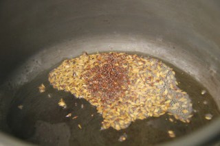 1. Heat ghee in a pressure cooker and cumin seeds, mustard seeds and curry leaves