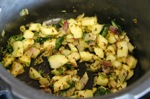 2.Add ginger, garlic, green chili, onion and turmeric and sauté for a minute.Add the apple cucumber and saute for 2 minutes.