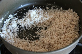 2.Roast the grated coconut in the same pan for 2 minutes.Roasting the coconut will release all the oils from it and add flavor to your dish.