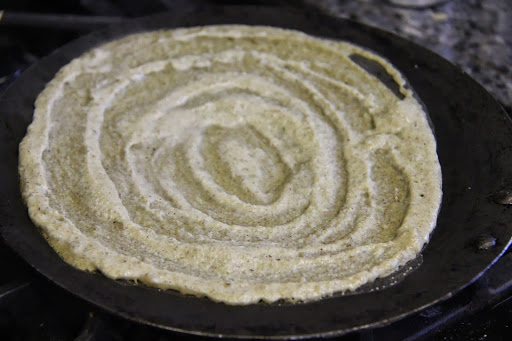 You can add grated carrot,green chili,ginger or finely minced onion on the pesarattu after rolling out the crepe on the pan for added flavor.