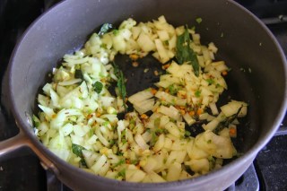 2.Add the garlic,green chili and onions and saute till golden brown.