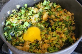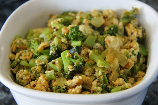 This dish is a stir fried egg and broccoli preparation tempered with Indian spices, served with rice or roti.