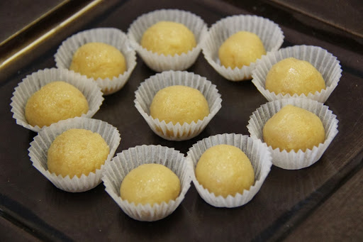 6.Refrigerate the kova for about half an hour. Take some ghee on your palm and roll the kova into roundels.Then gently press in centre to make a Peda.