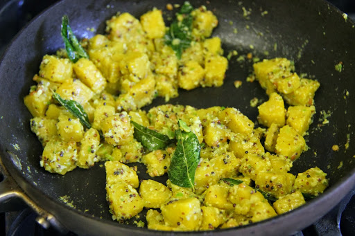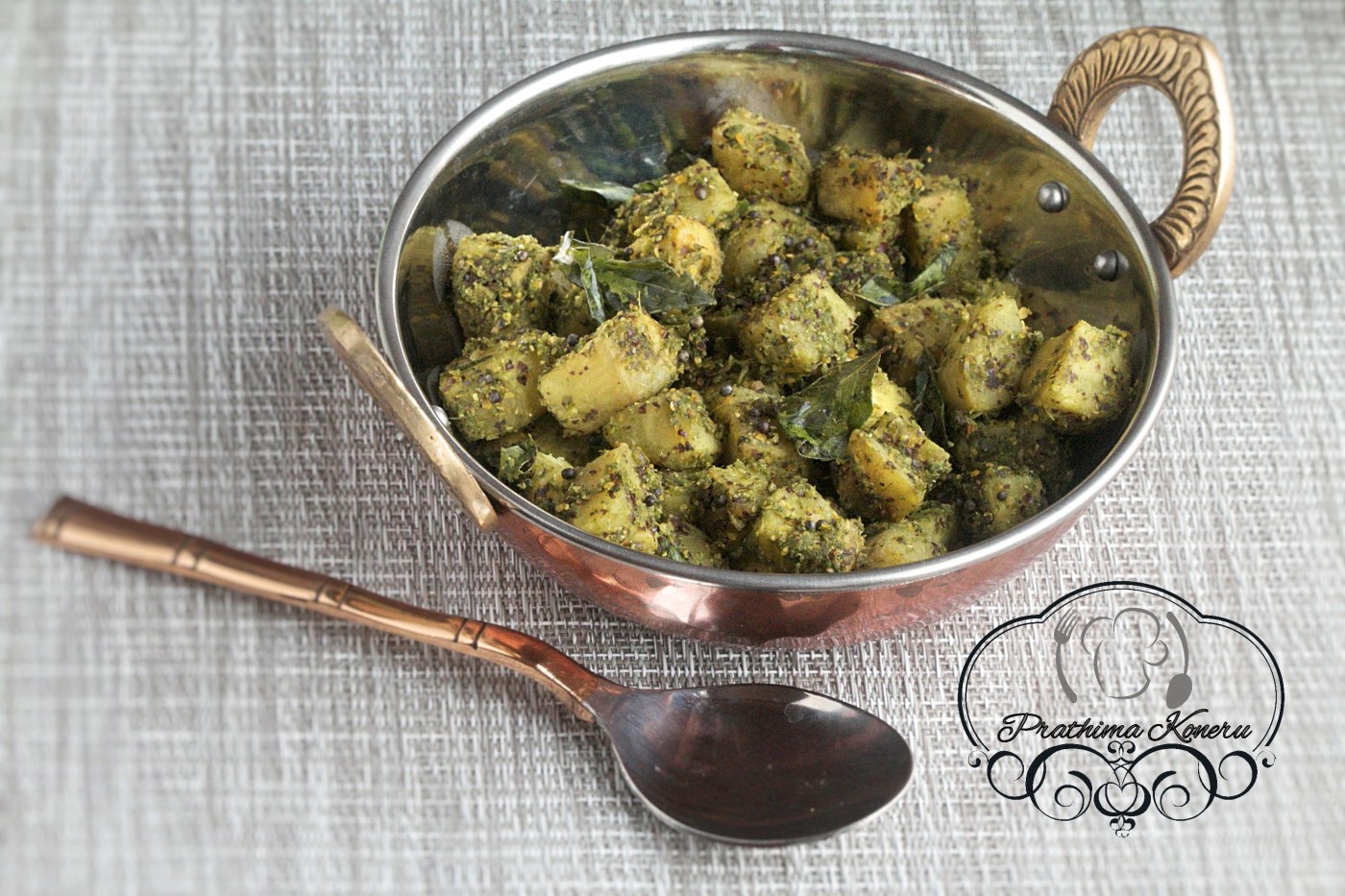This dish is composed of boiled plantain tempered in a mixture of ground mustard and grated fresh coconut, green chili and spices.