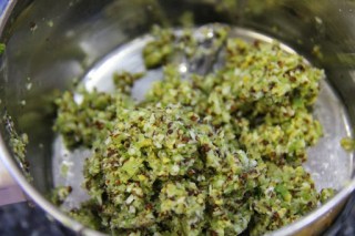 2.In a grinder take the 2 teaspoons of mustard seeds, green chili, ginger, coconut and rice rava and grind to a smooth paste.