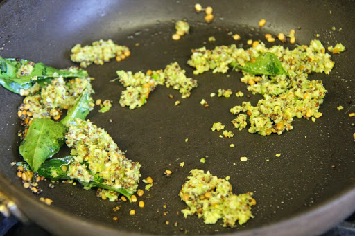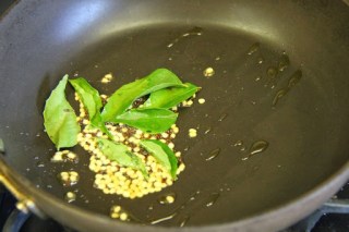 3.Heat oil in a pan and add urad dal and let lightly brown, add the mustard seeds and curry leaves and let splutter.
