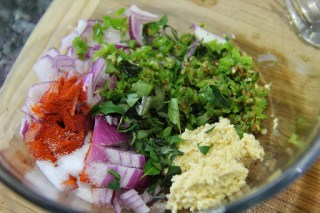 1.In a bowl take the onion,green chili,ginger garlic paste,red chili powder,salt and curry leaves.