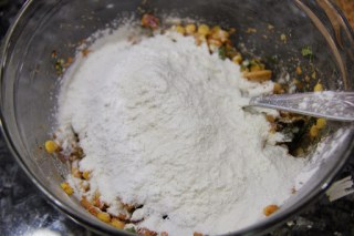 7.Make some holes with your finger and add a drop of oil in each of the holes, you can add more oil if you like crispier sarvapindi.
