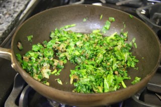 3.Chop the mushroom stems and saute them with the onions and garlic for 2 minutes.Add the chopped spinach and saute until soft.