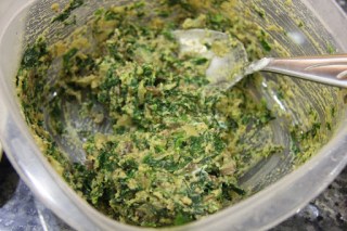 4.In a bowl take the spinach mixture, add the sour cream, bread crumbs,salt, sriracha and mix.